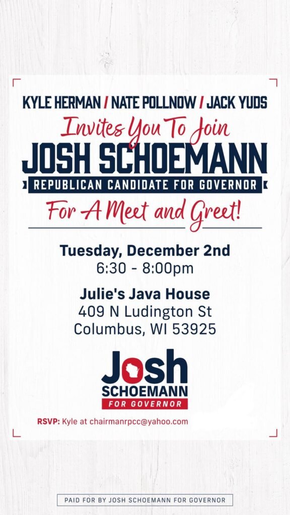 We invite you to come and meet Josh Schoemann candidate for Governor. We will be meeting him on Tuesday, December